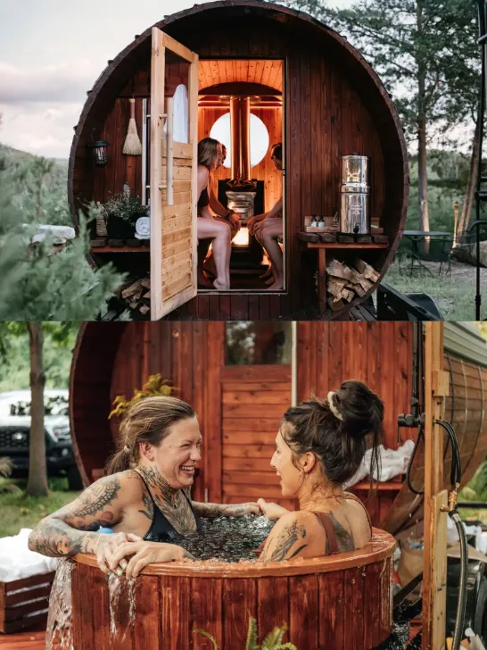 Private off-grid work pods fully equipped with solar electricity, high-speed internet, and unlimited access to the wood fired sauna and cold plunge.